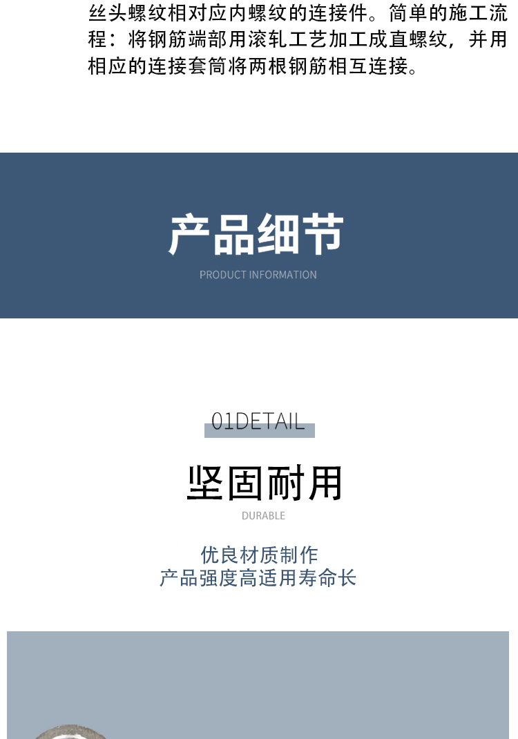 鋼筋套筒又名鋼筋接頭:用以連接鋼筋且具有與絲頭螺紋相對應(yīng)內(nèi)螺紋的連接件。簡單的施工流程:將鋼筋端部用滾軋工藝加工成直螺紋,并用相應(yīng)的連接套筒將兩根鋼筋相互連接。鋼筋套筒通常是用精密鋼管進(jìn)行生產(chǎn)的。專門用于生產(chǎn)鋼筋套筒的精密鋼管采用的是45#鋼材,通常又被稱為“鋼筋連接套管”。鋼筋套筒***可靠,連接方便,便于檢測。