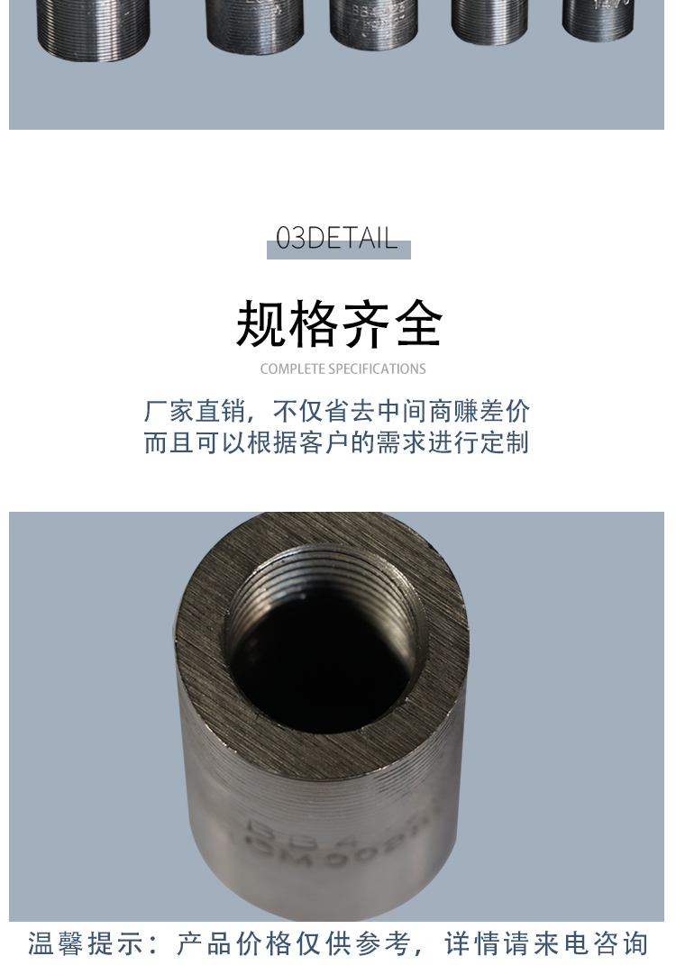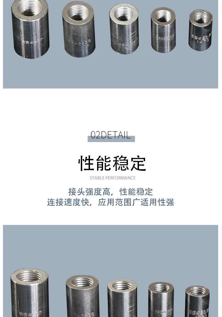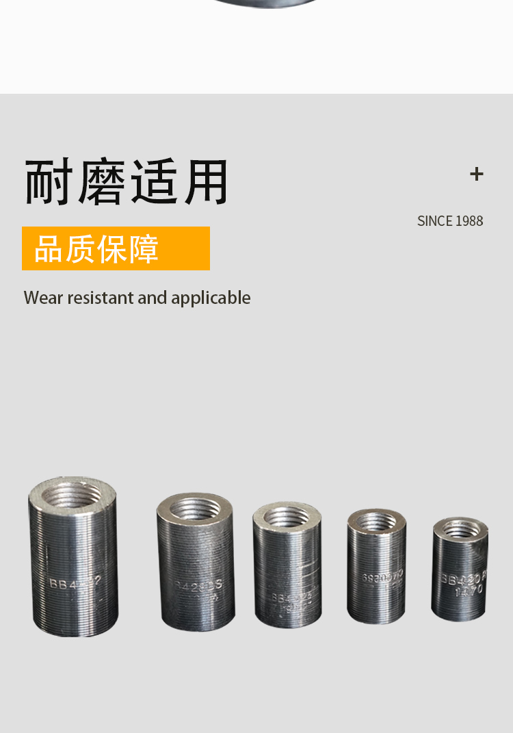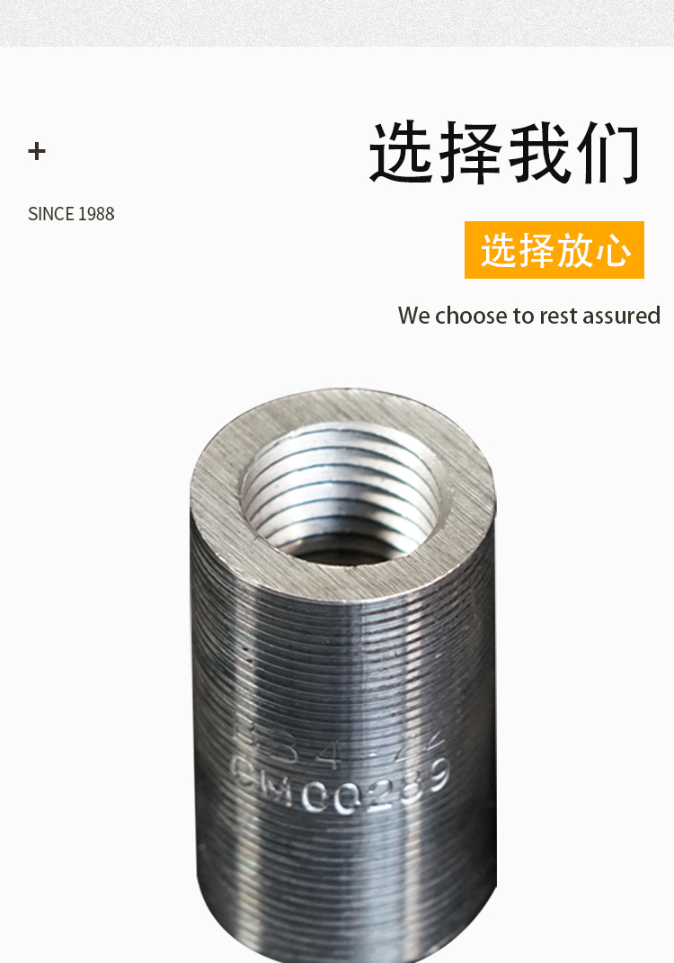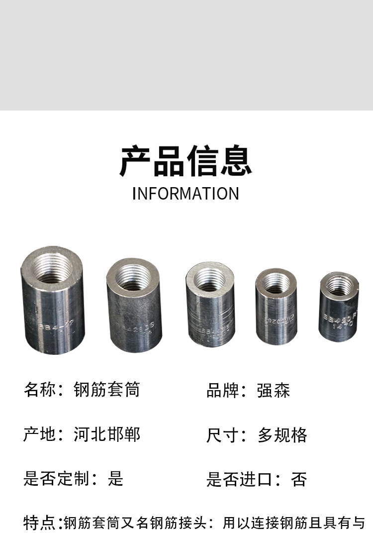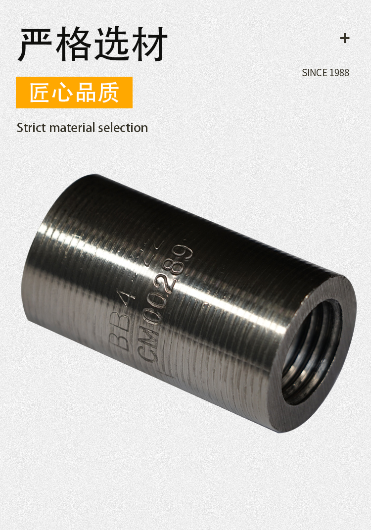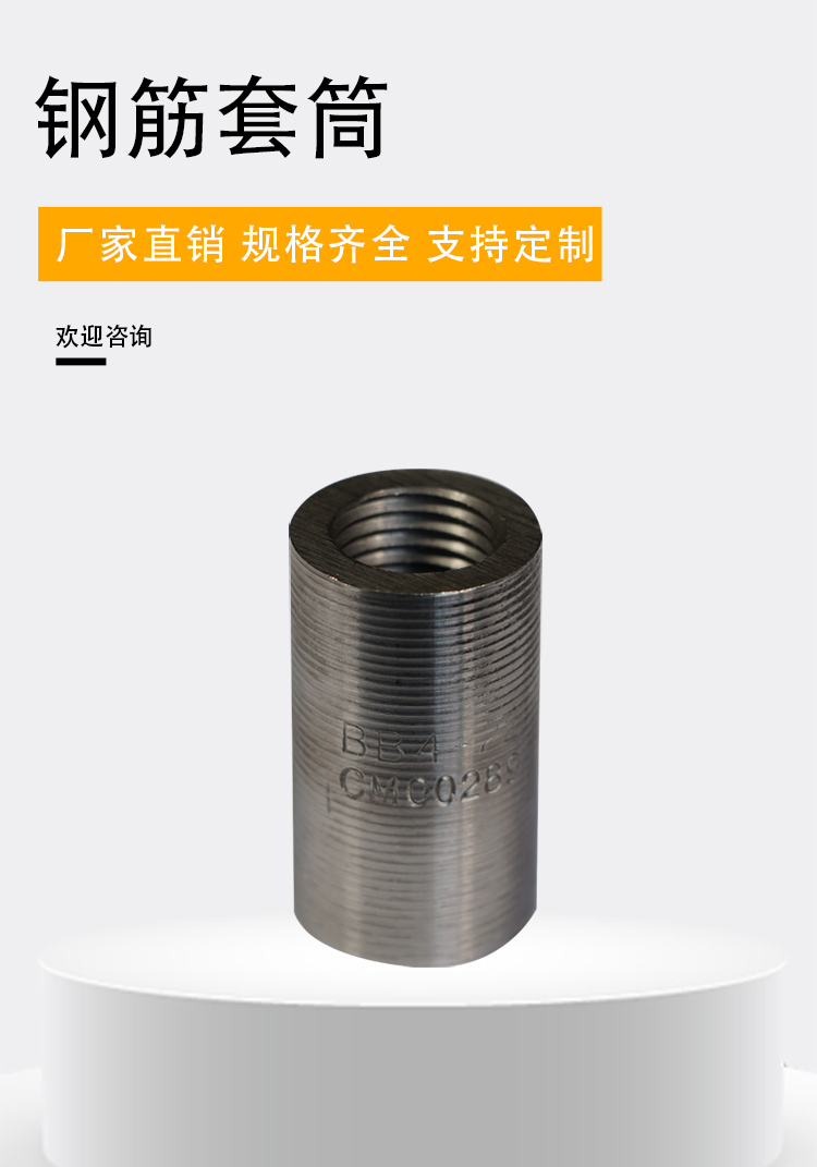 鋼筋套筒又名鋼筋接頭:用以連接鋼筋且具有與絲頭螺紋相對應(yīng)內(nèi)螺紋的連接件。簡單的施工流程:將鋼筋端部用滾軋工藝加工成直螺紋,并用相應(yīng)的連接套筒將兩根鋼筋相互連接。鋼筋套筒通常是用精密鋼管進(jìn)行生產(chǎn)的。專門用于生產(chǎn)鋼筋套筒的精密鋼管采用的是45#鋼材,通常又被稱為“鋼筋連接套管”。鋼筋套筒***可靠,連接方便,便于檢測。